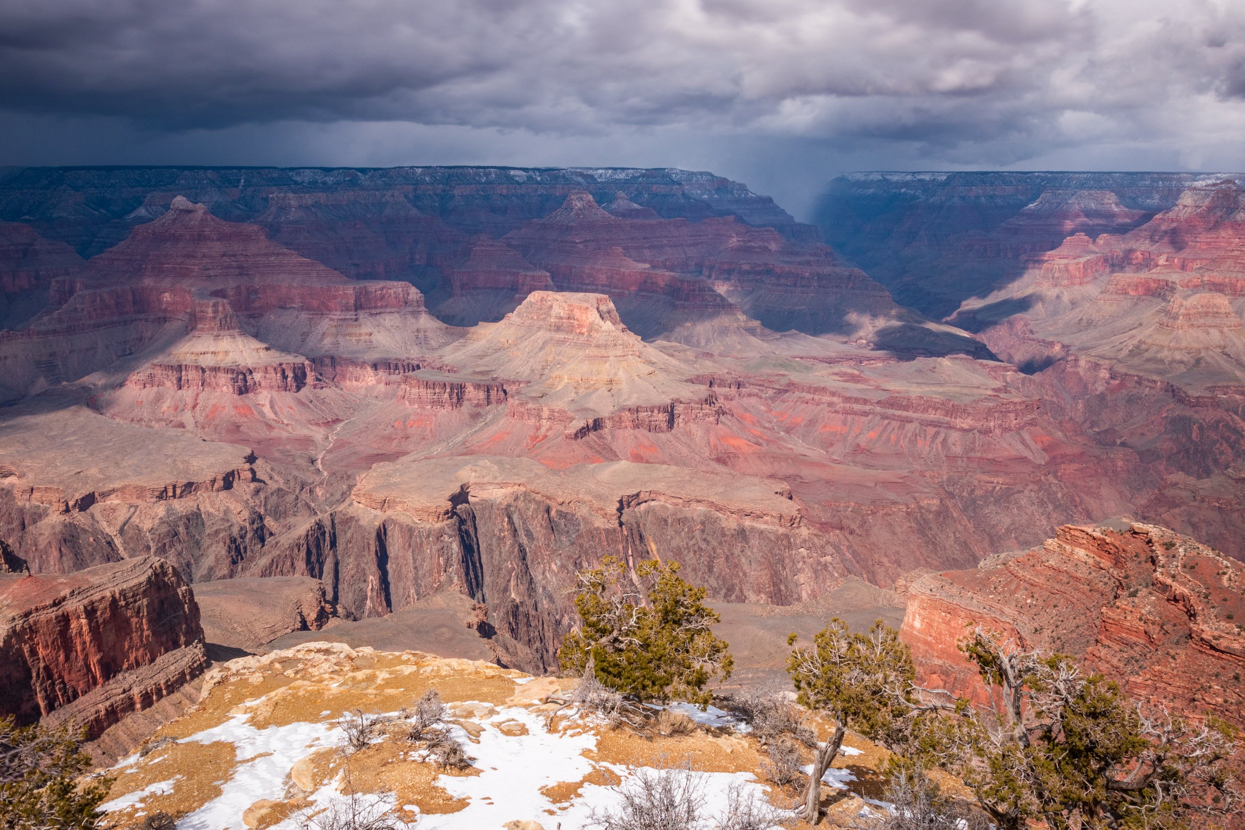 Arriving at Desert View, the first significant stop-off point in the park, we reassessed our plan over coffee. Initially, we had planned to do some hiking along the Rim Trail in the afternoon, with a follow-on hike the following day down and back up the South Kaibab Trail. Having not discounted the possibility of the latter, we purchased some microspikes at the shop before taking in our first views of the Grand Canyon itself.